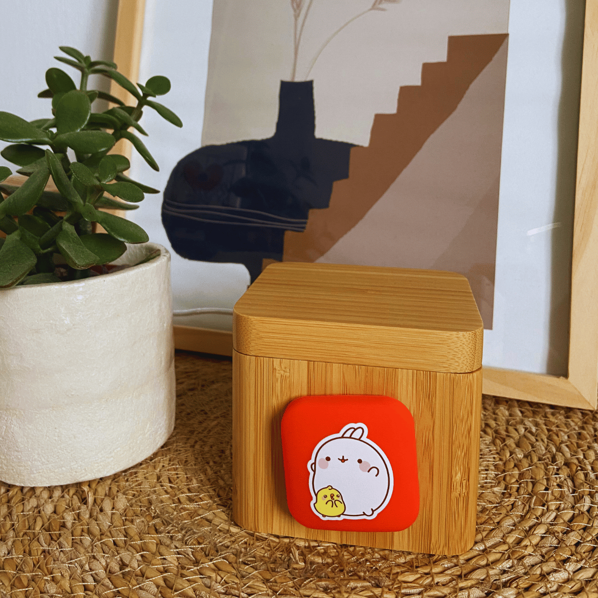 Une Lovebox Couleur & Photo Molang avec son spinny Molang et sa gravure.
